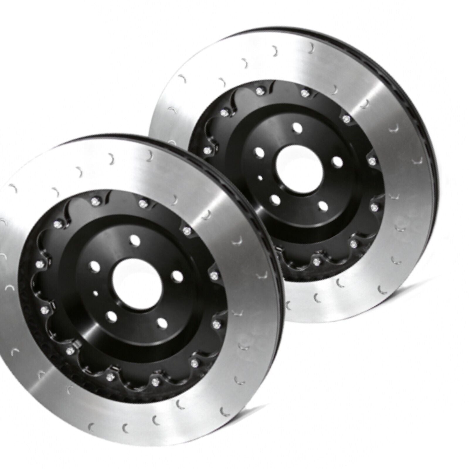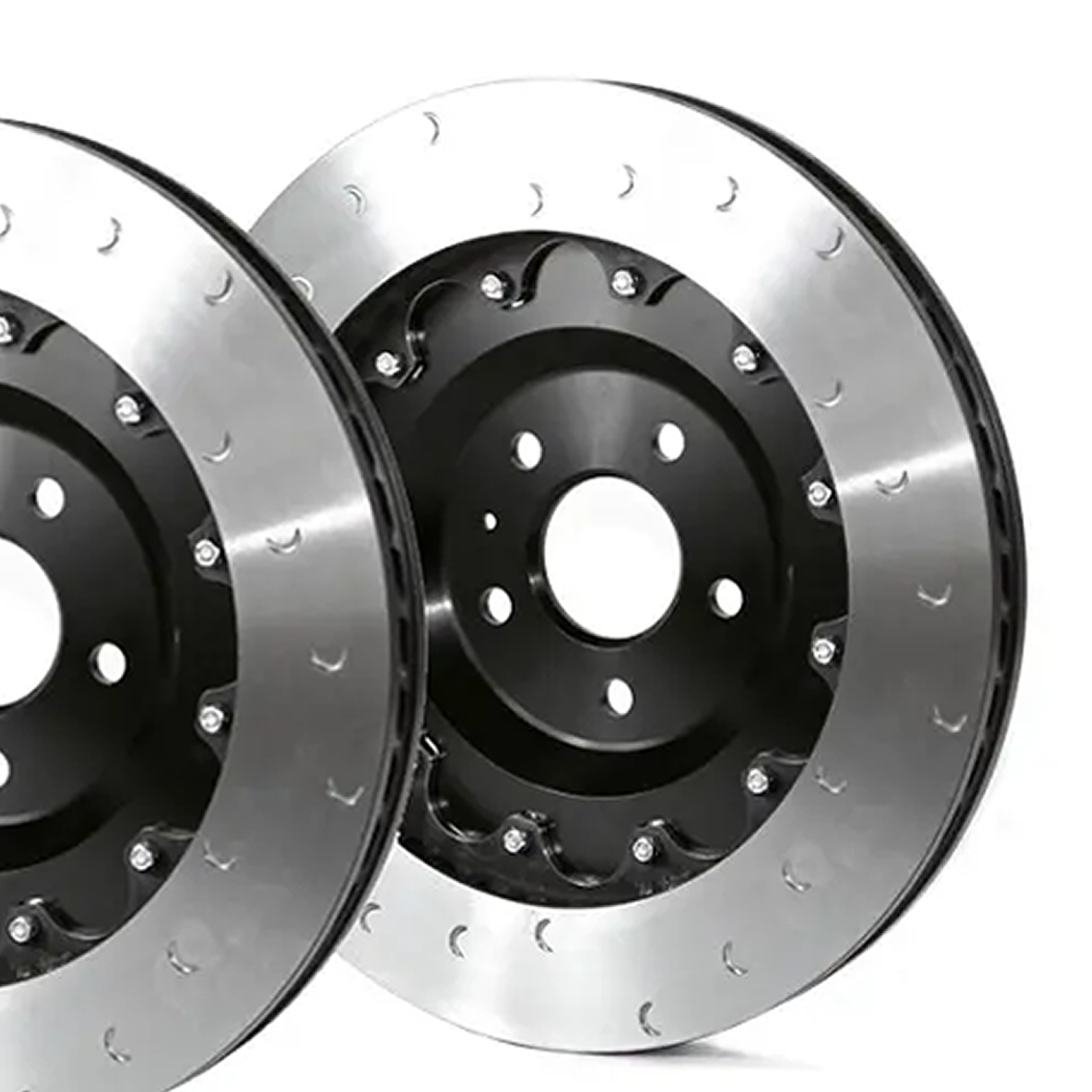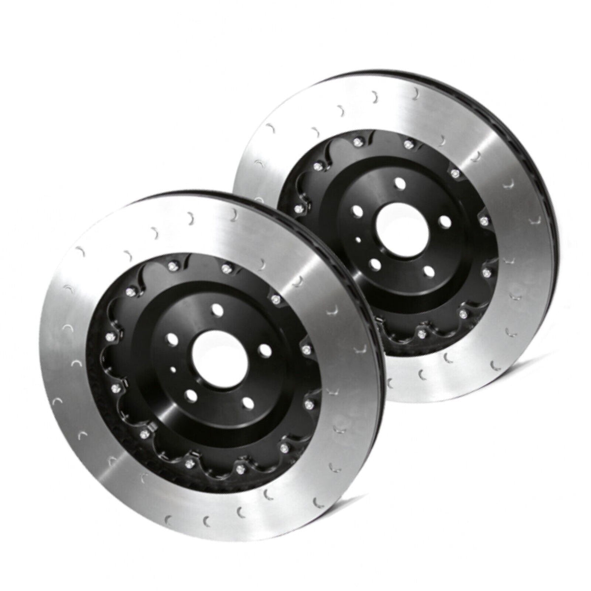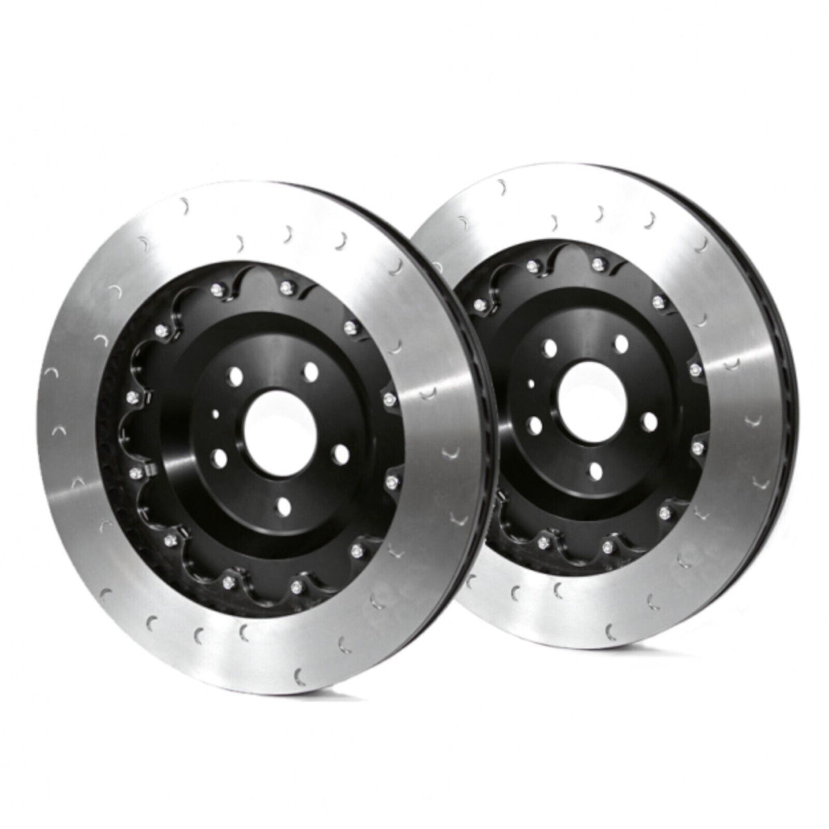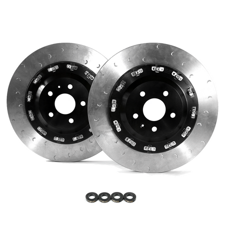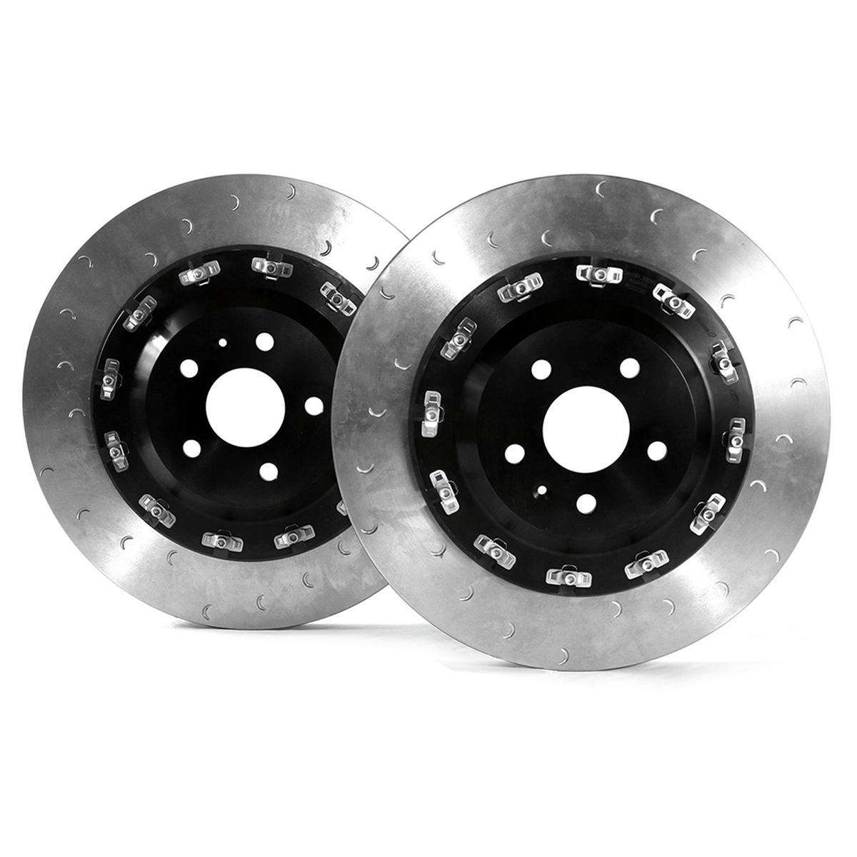 Utilising a two-piece floating design allows the disc and hat to expand radially and axially as they absorb heat generated from use, avoiding the most common cause of warping and cracking seen in single-piece rotors. Due to the efficiency of this design, Revo discs last considerably longer than factory discs. The friction surface features crescent groves that increase bite and remove debris from the pad surface giving the perfect balance between brake feel and longevity while minimizing the pedal pulsations normally associated with straight-slotted rotors or cracking issues common with cross-drilled rotors.