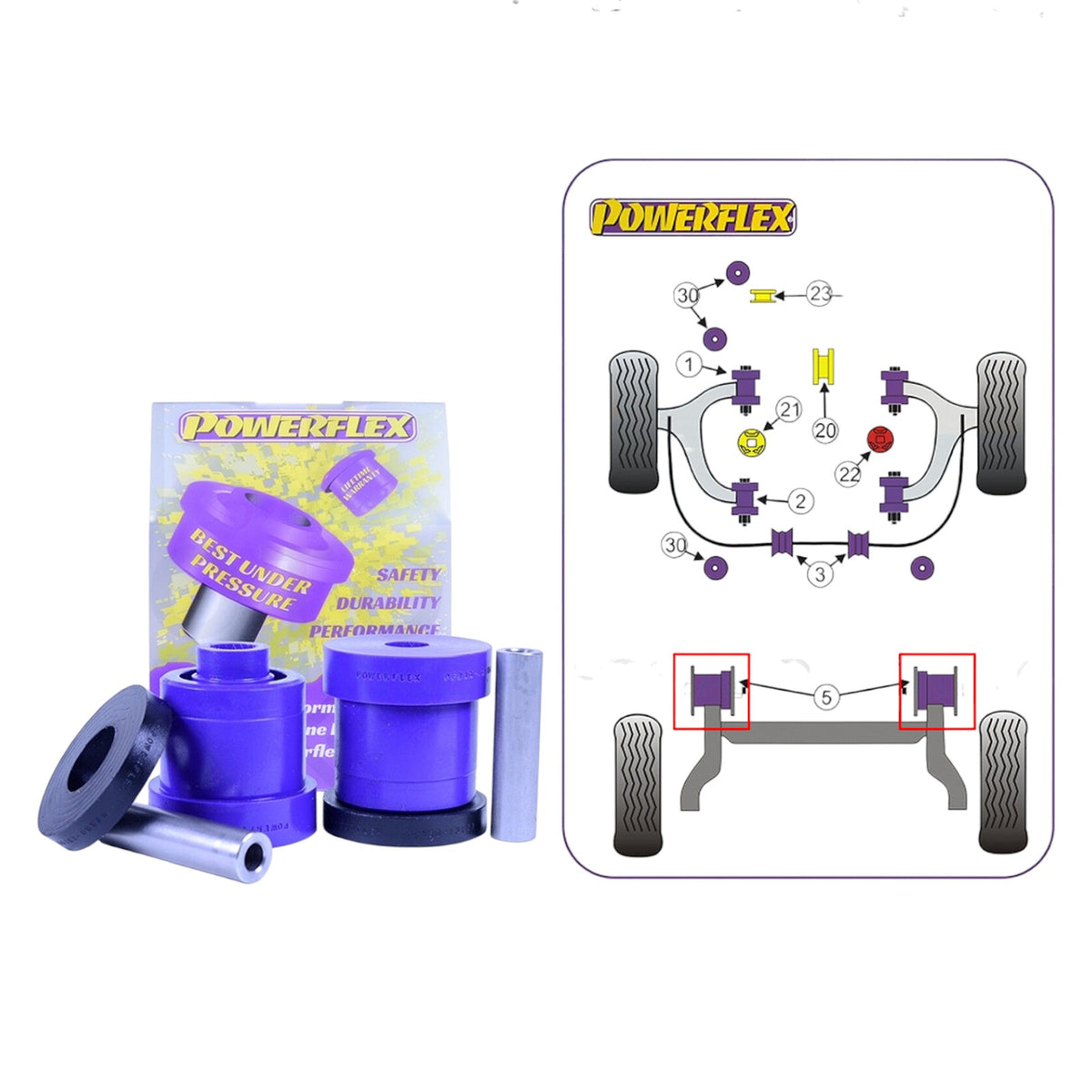 POWERFLEX for prolonged tyre life.With the technological advances in this material it has been possible to overcome the common problem associated with harder bushes which is increased noise. By correctly engineering the polyurethane compound, bushes can be made 25-30% stiffer than new rubber items but with exactly the same noise absorbing properties.