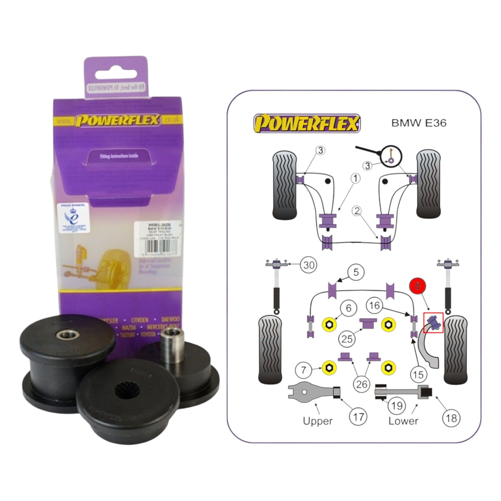 POWERFLEX for prolonged tyre life.With the technological advances in this material it has been possible to overcome the common problem associated with harder bushes which is increased noise. By correctly engineering the polyurethane compound, bushes can be made 25-30% stiffer than new rubber items but with exactly the same noise absorbing properties.